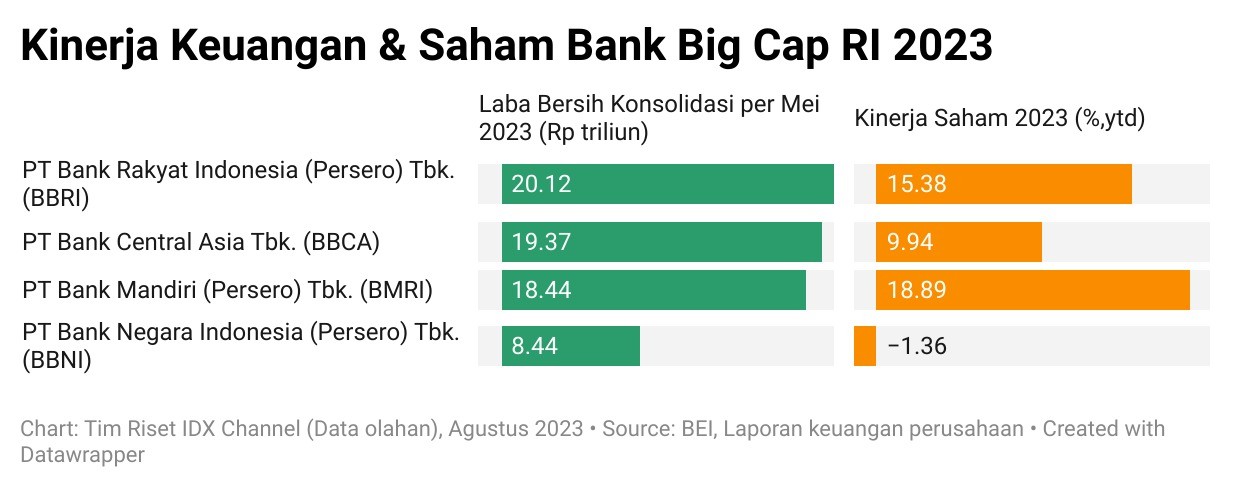 PT Bank Rakyat Indonesia Tbk (BBRI) mencatatkan laba bersih tertinggi di antara empat pesaingnya mencapai Rp20,12 triliun per Mei 2023. Kinerja saham perbankan paling moncer secara year to date (ytd) disabet Bank Mandiri (BMRI) sebesar 18,89 persen. (Lihat grafik di bawah ini.)