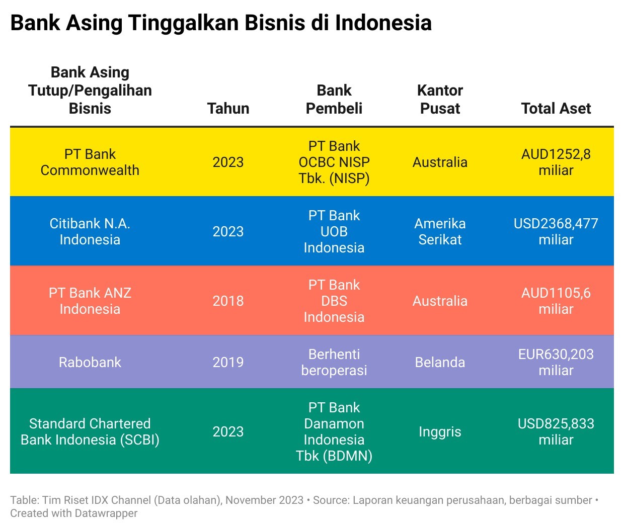 Dalam beberapa tahun terakhir, sejumlah bank asing memilih hengkang dari bisnisnya di Indonesia.