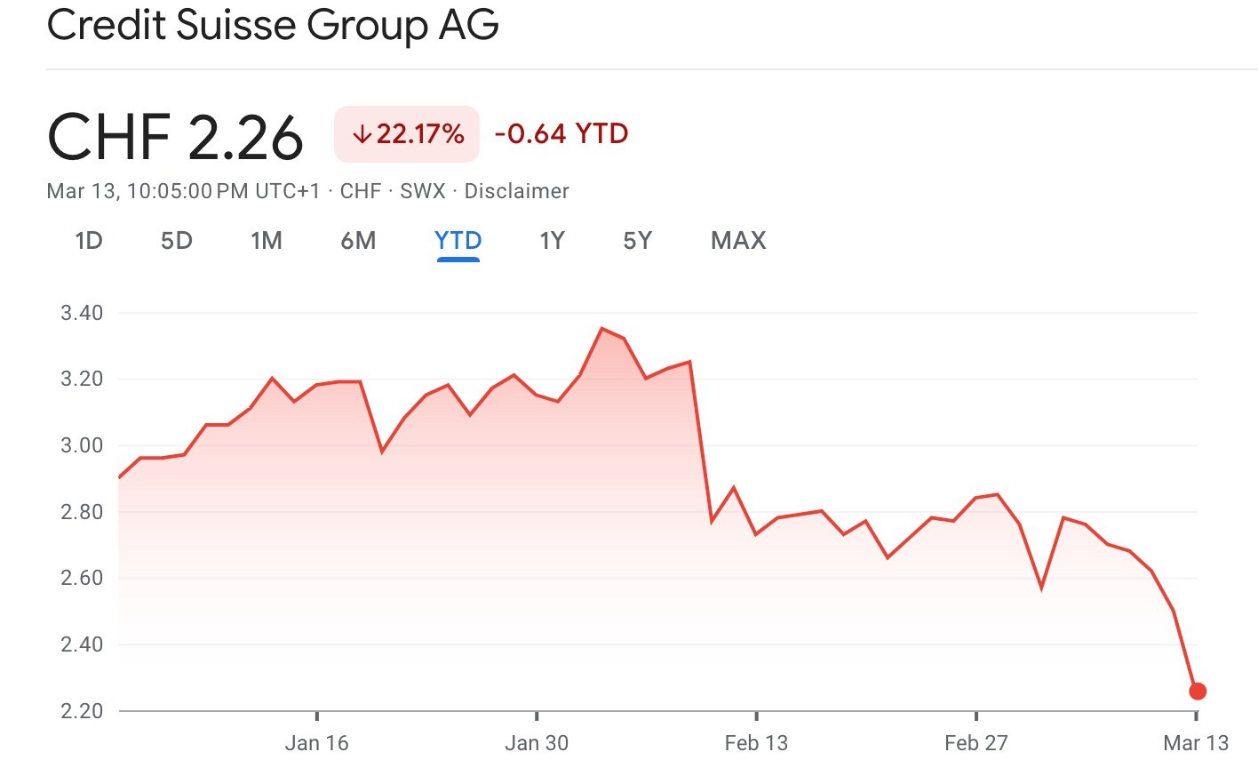 Adapun kinerja saham Credit Suisse menurun 9,58% pada perdagangan Senin (13/3) dan secara year to date (ytd) kinerja saham Credit Suisse telah anjlok sebesar 22,17%. (Lihat grafik di bawah ini.)