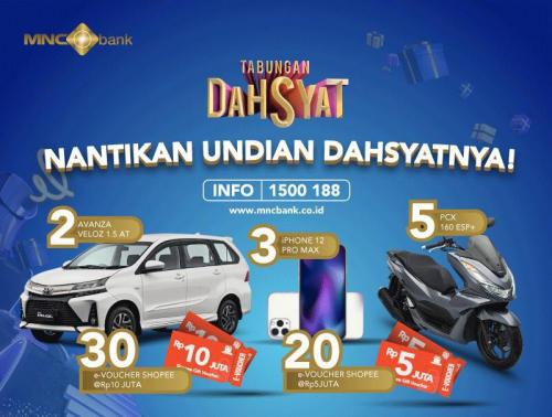 MNC Bank, yang merupakan unit usaha PT MNC Kapital Indonesia Tbk (BCAP) di bawah naungan MNC Group, akan mengundi Tabungan Dahsyat yang ke-6 dengan hadiah bernilai miliaran rupiah. Mulai dari 2 Avanza Veloz 1.5 AT, 5 Honda PCX, 3 iPhone 12 Pro Max, 30 e-voucher Shopee masing-masing Rp10 juta, hingga 20 e-voucher Shopee masing-masing Rp5 juta siap dihadiahkan. Bagi yang belum menabung, segera bergabung agar merasakan berbagai hadiah dahsyatnya.