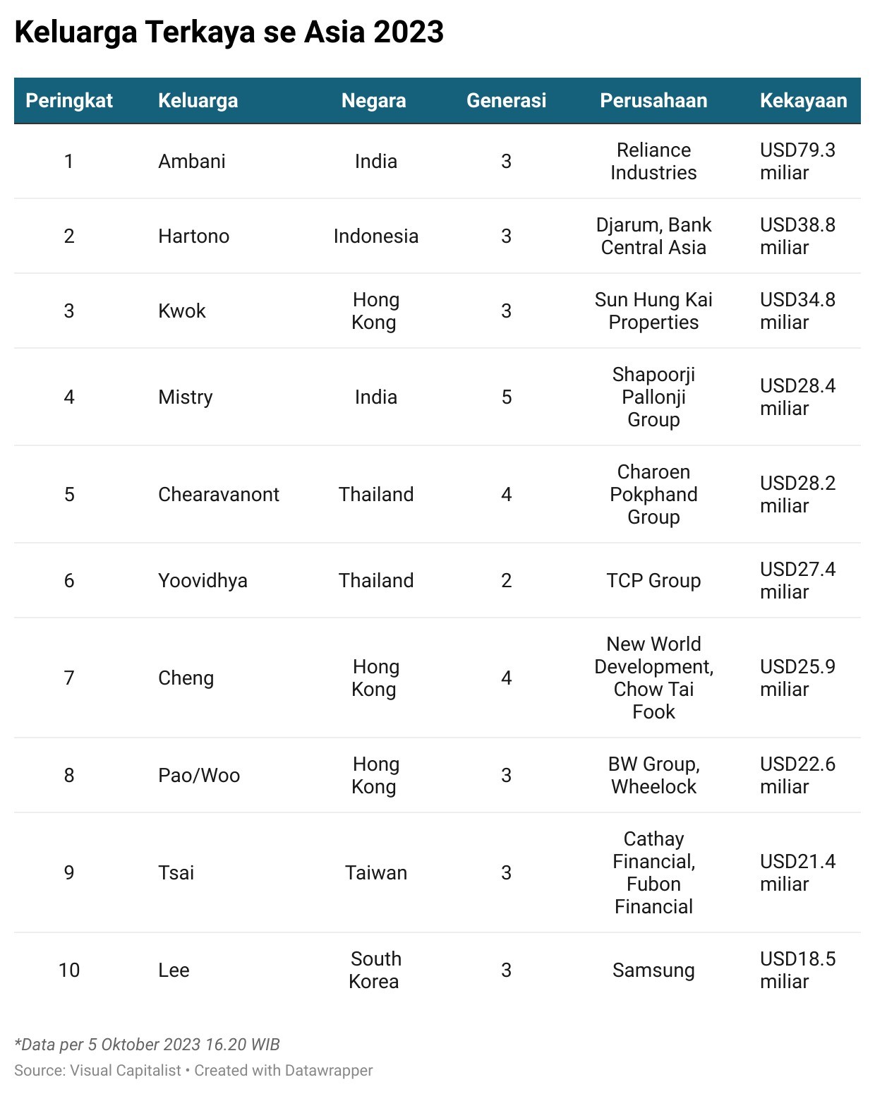 Berikut deretan 10 keluarga terkaya se-Asia 2023. (Lihat tabel di bawah.)