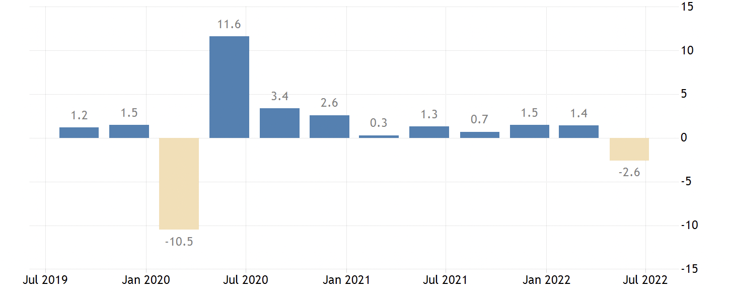 Laporan terbaru Trading Economics, ekonomi China menyusut minus 2,6% dalam tiga bulan hingga Juni 2022. Kondisi ini lebih tinggi daripada perkiraan pasar sebesar 1,5%. Ini adalah kontraksi pertama sejak kuartal 1 2020, ketika wabah Corona di Wuhan merebak menjadi epidemi yang meluas. (Lihat grafik di bawah ini)