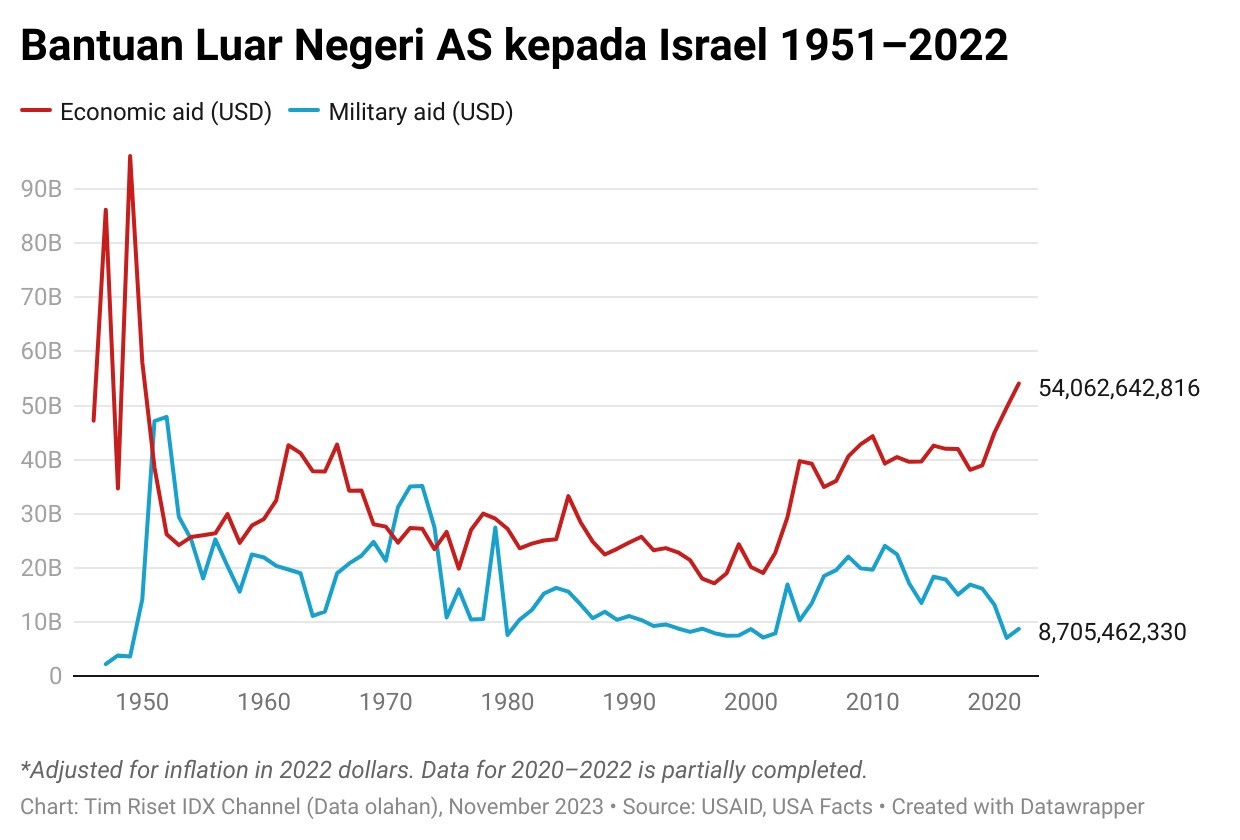 Jika disesuaikan dengan inflasi, bantuan AS ke Israel dari tahun 1946 hingga 2022 berjumlah USD243,9 miliar, dan menjadikannya penerima bantuan luar negeri AS terbesar sejak Perang Dunia II.