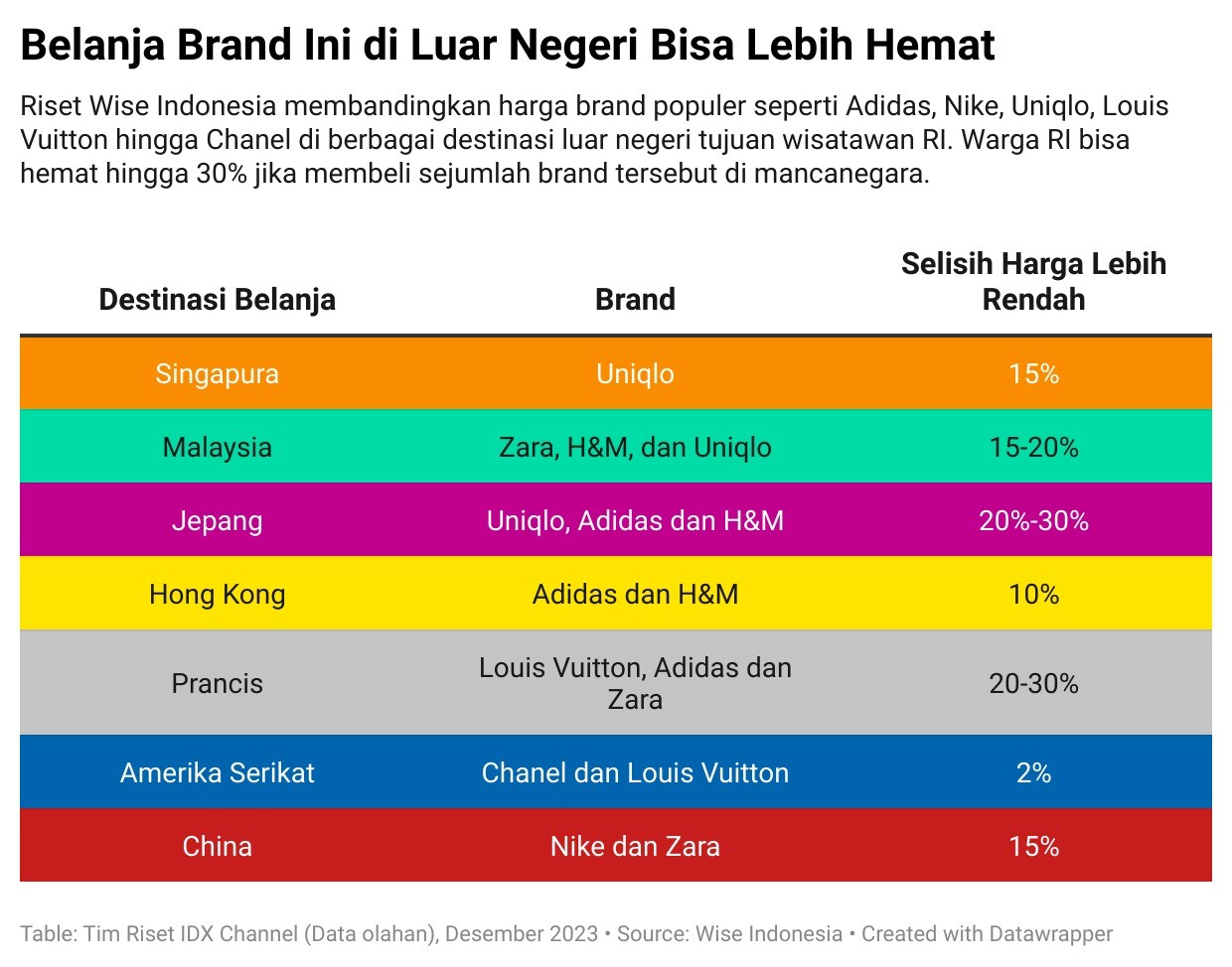 Penggemar produk Uniqlo akan mendapatkan harga yang 15 persen lebih murah di Singapura daripada di Indonesia. Namun, untuk produk Chanel dan Louis Vuitton, harganya justru 1-4 persen lebih mahal.
