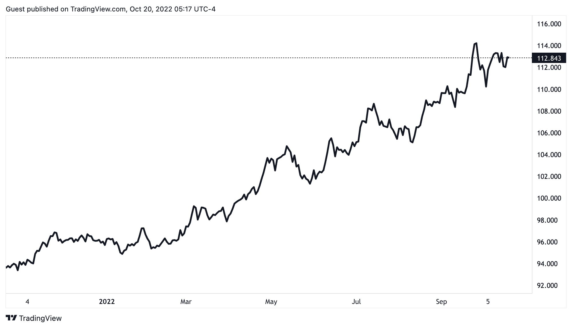 Pada perdagangan hari ini (20/10), indeks dolar AS masih berada pada angka 112,84 setelah sebelumnya menyentuh all-time high pada angka 114,188 pada 26 September lalu yang merupakan level tertinggi dalam lebih dari 20 tahun terakhir. (Lihat grafik di bawah ini)