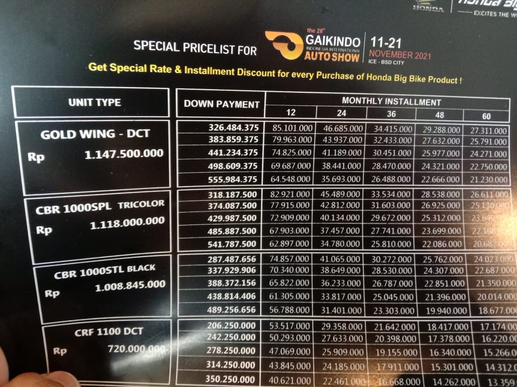 Untuk memiliki Goldwing tersebut, Honda menawarkan skema harga kredit. Namun besaran uang muka atau DP paling murah moge tersebut bikin melonggo karena dipatok harga Rp326 jutaan.