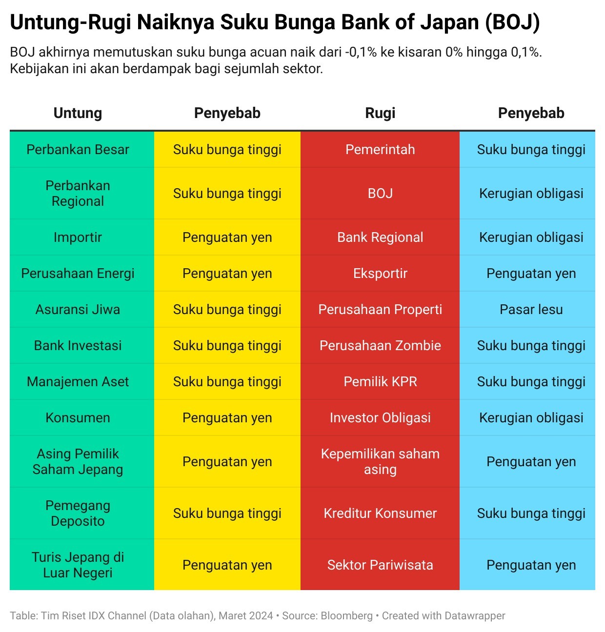 Selain itu, menurut Bloomberg, terdapat pihak yang akan diuntungkan dan dirugikan oleh naiknya suku bunga di Jepang.