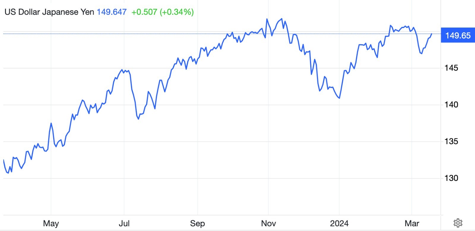 Dampak dari spekulasi kenaikan suku bunga BOJ membuat pasar saham Jepang, terutama indeks Nikkei 225 turun dari rekor tertinggi, dan juga menyebabkan yen jatuh ke 149,65 terhadap dolar AS pada hari ini. (Lihat grafik di bawah ini.)