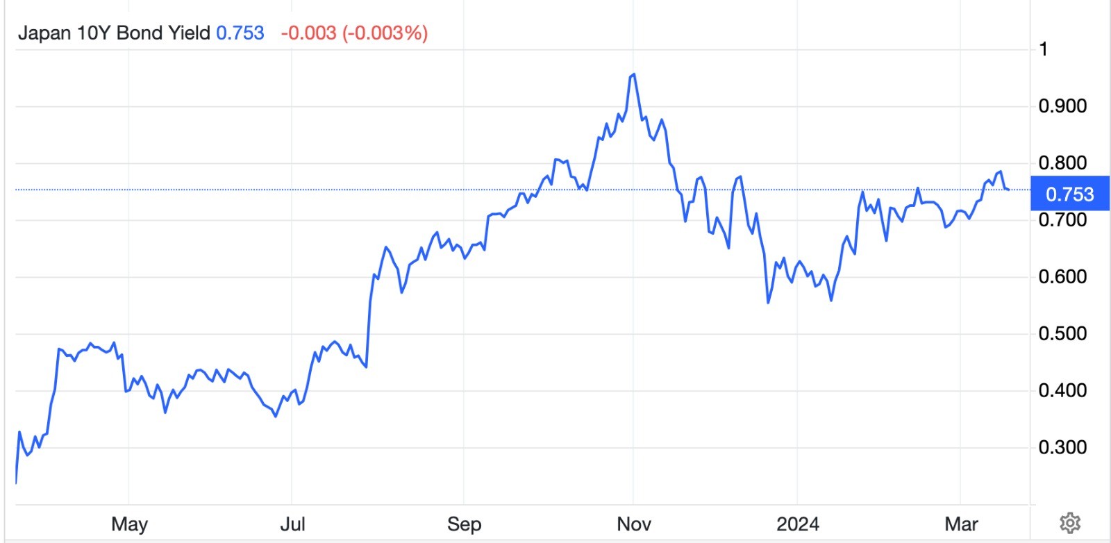 Imbas pengumuman BOJ terbaru, Imbal hasil (yield) obligasi pemerintah Jepang bertenor 10 tahun juga turun menjadi sekitar 0,76 persen, mundur dari level tertinggi dalam tiga bulan karena investor bersiap menyambut keputusan BOJ. (Lihat grafik di bawah ini.)