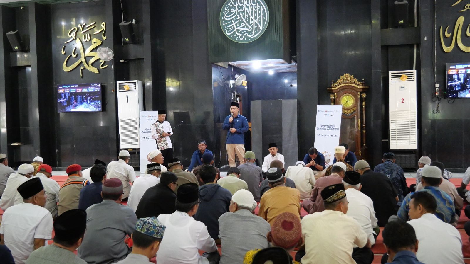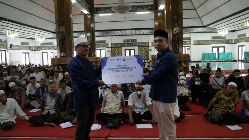 Bantuan diberikan secara simbolis oleh Wakil Ketua Panitia Ramadan PTBA Ihwani Maris dan VP Pengadaan Aset dan Infrastruktur Sipil Penunjang PTBA Ichsan Aprideni kepada pengurus DKM Masjid dan Musala di Masjid Jamik Bukit Asam, Tanjung Enim, Selasa (11/4/2023).