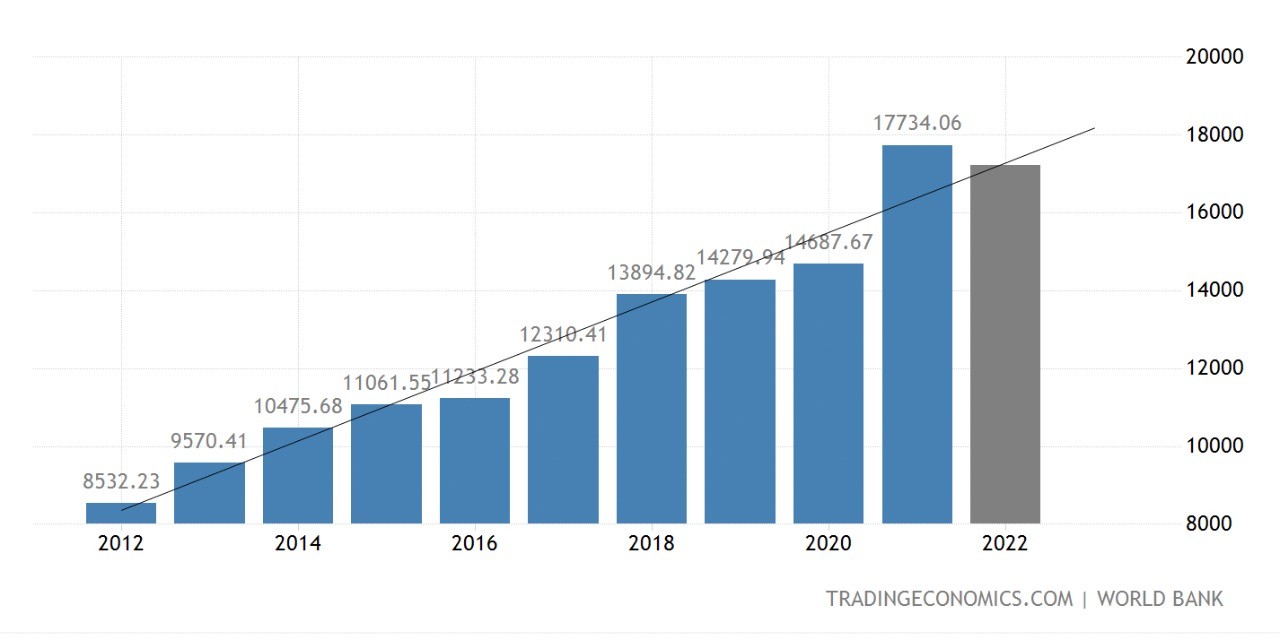 PDB negara Tirai Bambu ini diproyeksikan mencapai USD18,46 miliar pada tahun 2022 menurut data Dana Moneter Internasional (IMF). Sementara di tahun 2021, PDB China mencapai USD17,73 miliar menurut data Bank Dunia. (Lihat grafik di bawah ini.)