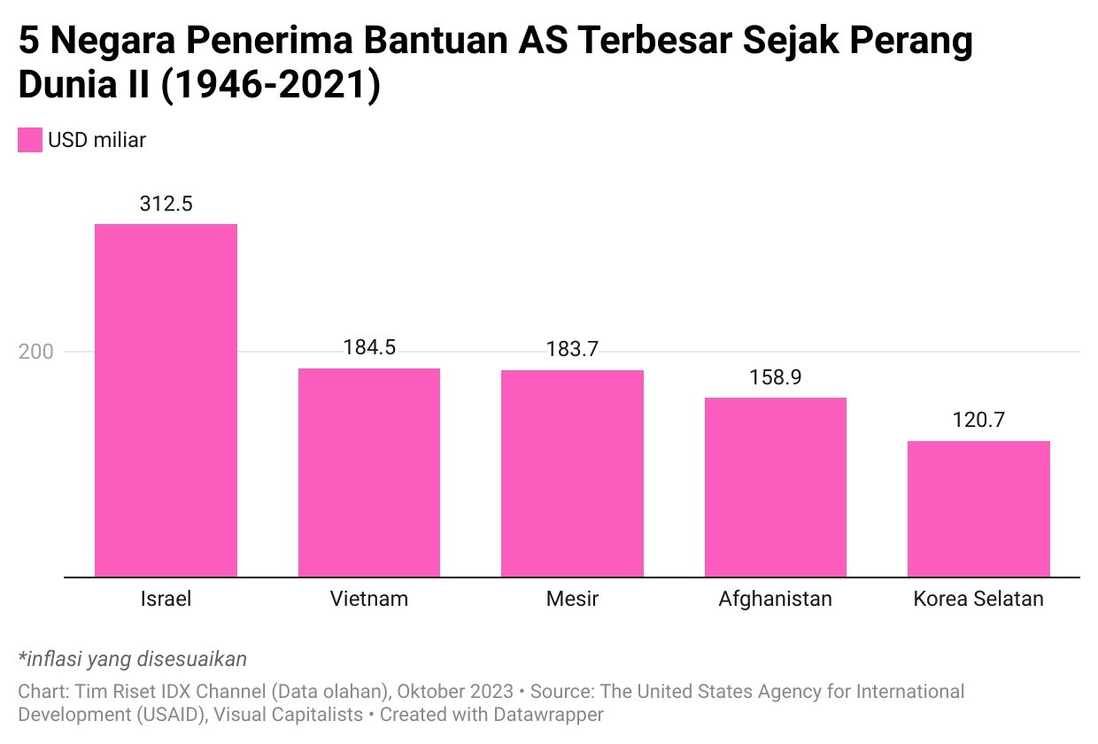 Israel sejauh ini merupakan penerima kumulatif terbesar bantuan luar negeri AS. Sejak tahun 1940-an, Israel telah menerima lebih dari USD300 miliar, dengan sebagian besar dalam bentuk dukungan militer. (Lihat grafik di bawah ini.)