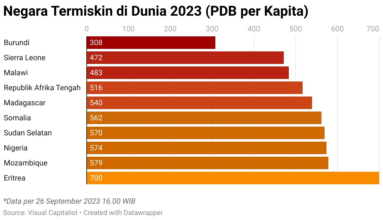 Sementara itu, Sierra Leone dan Malawi, yang juga berasal dari Afrika, memiliki PDB per kapita terendah di peringkat selanjutnya, masing-masing hampir USD200 lebih tinggi daripada Burundi.