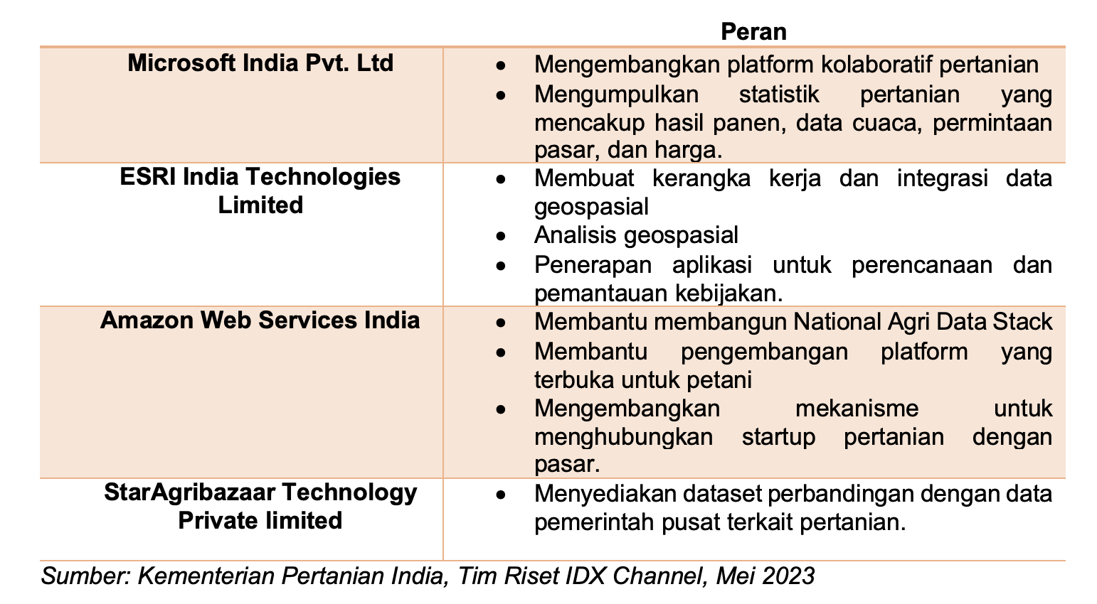 Bahkan pemerintah India telah menandatangani MoU dengan sejumlah perusahaan teknologi seperti Microsoft India, Amazon Web Services (AWS), ESRI India,Star Agribazaar, Patanjali Organic Research Institute Private Limited, JIO Platforms Ltd, ITC Limited, Cisco Commerce India Pvt Ltd, NCDEX e-Markets Ltd (NeML), Ninjacart – 63Ideas Infolabs Pvt Ltd, Artificial Intelligence Unit of National Entrepreneurship Network (Wadhwani AI) untuk mendukung program ini. (Lihat tabel di bawah ini.)
