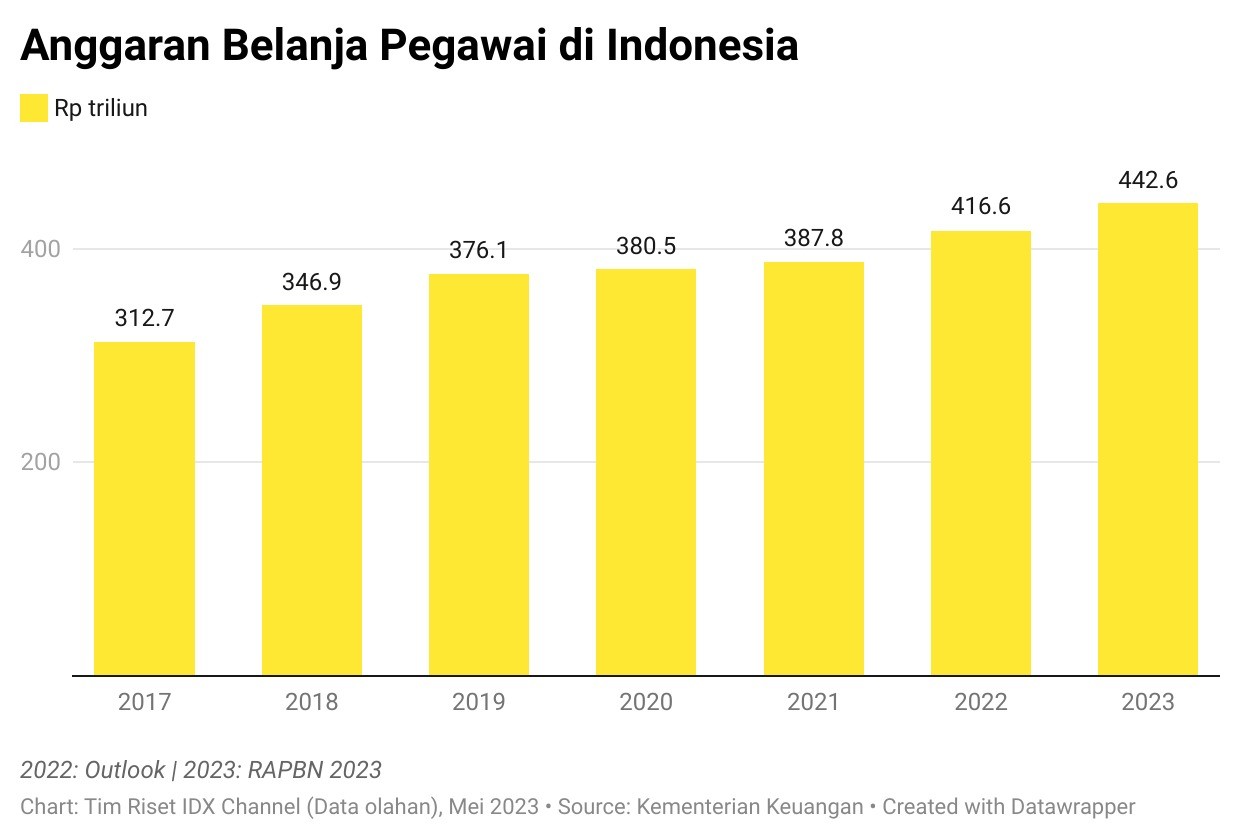 Dalam Buku II Nota Keuangan beserta Rancangan Anggaran Pendapatan dan Belanja Negara (RAPBN) Tahun Anggaran 2023 yang dirilis Kementerian Keuangan pada Selasa (16/8/2022), outlook belanja pegawai pemerintah pusat 2022 diperkirakan mencapai sekitar Rp416,61 triliun. Pada 2023 nilainya ditambah menjadi Rp442,57 triliun.