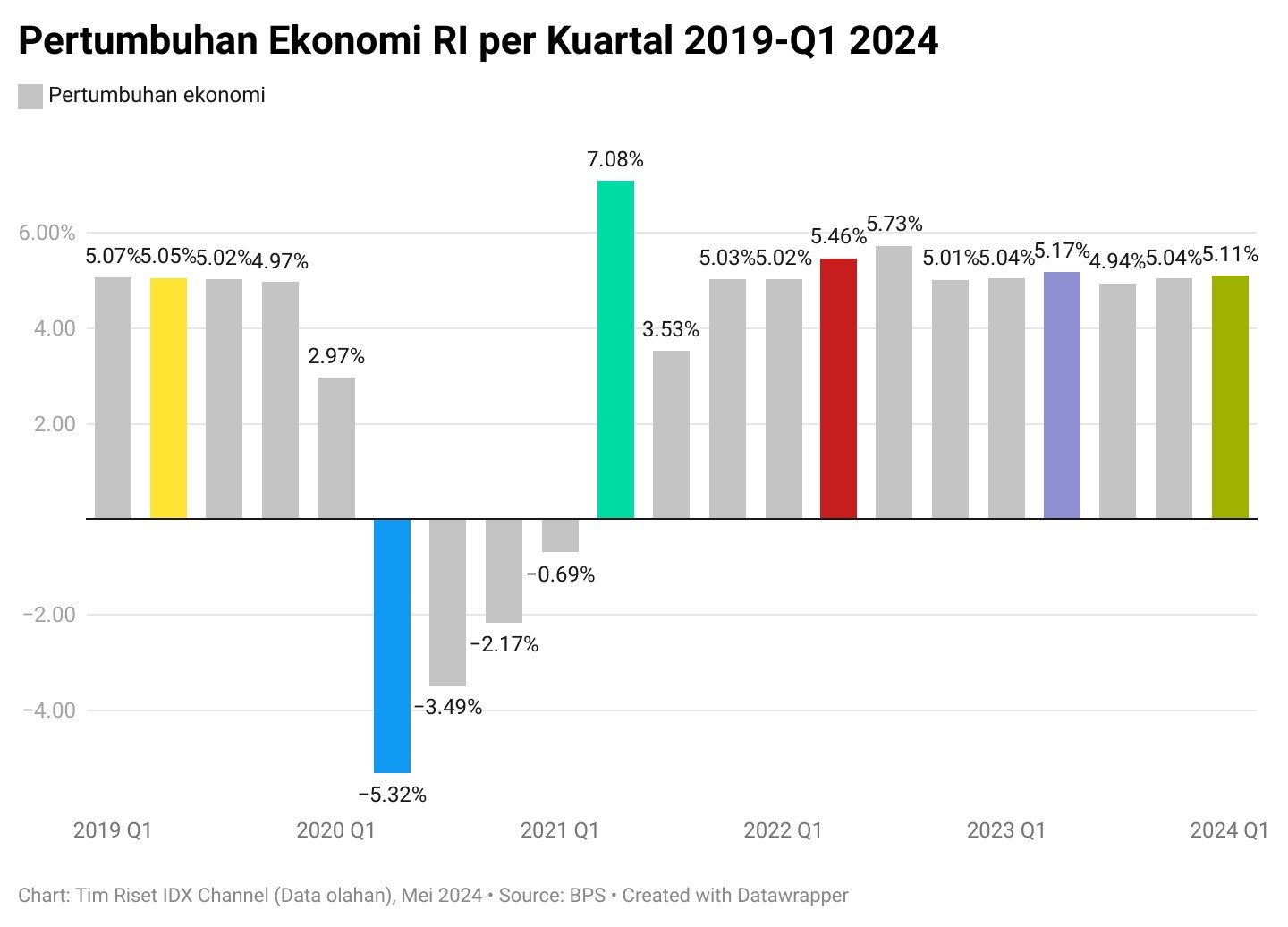 IDXChannel - Badan Pusat Statistik (BPS) melaporkan ekonomi Indonesia tumbuh 5,11 persen pada kuartal-I 2024 dibandingkan periode yang sama tahun lalu (year-on-year/yoy).