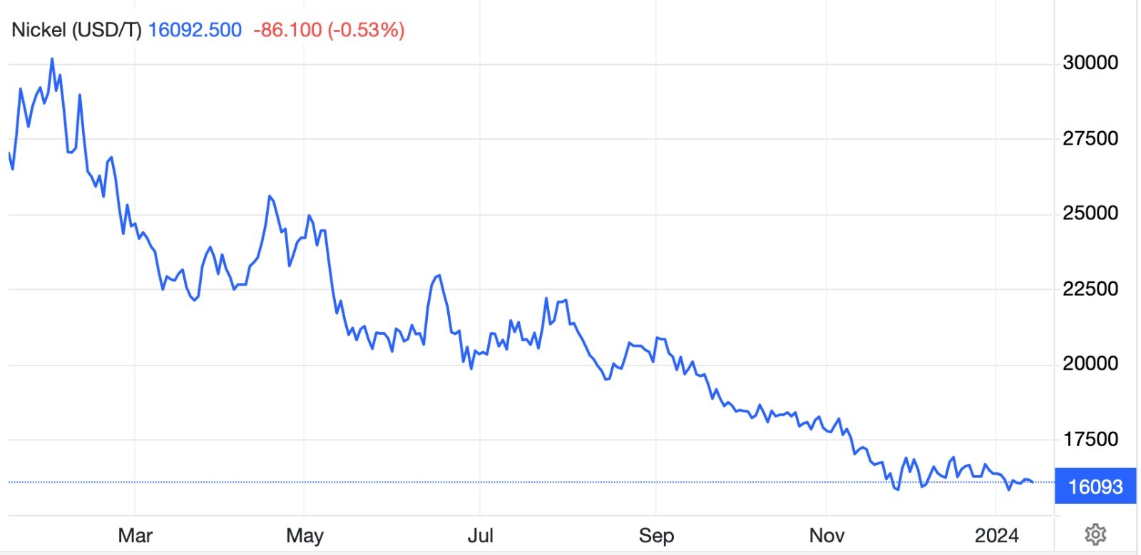 Melansir Trading Economics, Senin (15/1/2024), harga nikel berjangka turun 0,53 persen di bawah USD16.500 per ton, mendekati posisi terendah dalam tiga tahun terakhir. (Lihat grafik di bawah ini.)