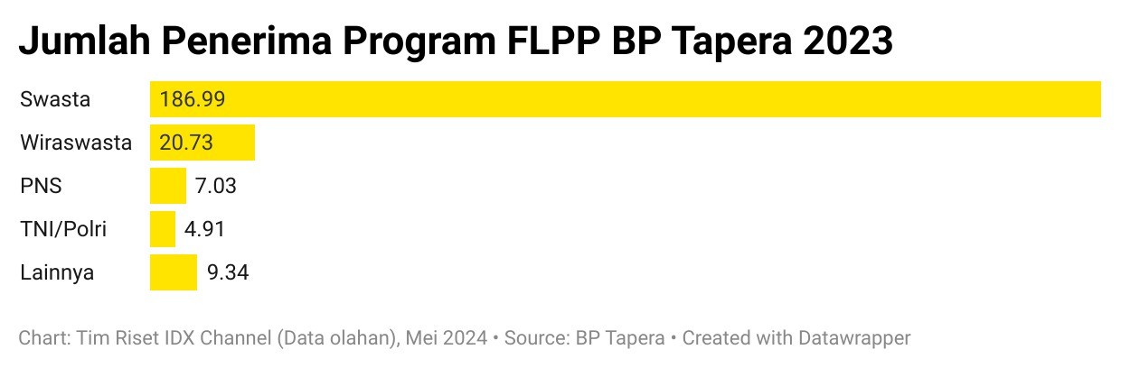 Menurut pekerjaannya, pekerja swasta menjadi penerima FLPP terbanyak dengan penyaluran rumah sebanyak 186.994 unit atau 81,66 persen sepanjang 2023.