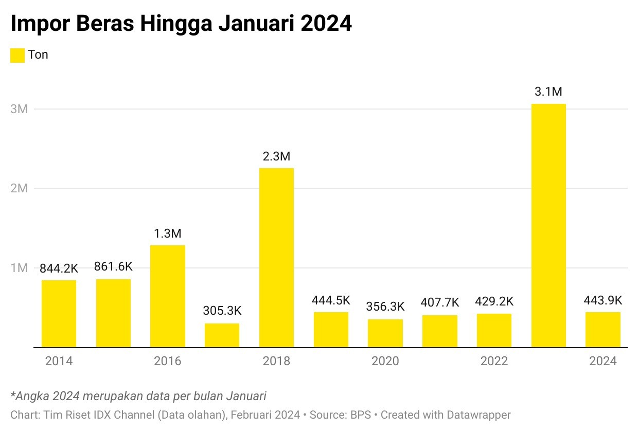 Berdasarkan data Badan Pusat Statistik (BPS), Indonesia melakukan impor beras sebanyak 443,91 ribu ton per Januari 2024. Volume impor beras ini bahkan sudah melampaui volume impor tahunan saat pandemi Covid-19 sepanjang 2020, 2021, dan 2022. Tahun lalu, impor beras tembus 3,06 juta ton, tertinggi sejak 2014. (Lihat grafik di bawah ini.)