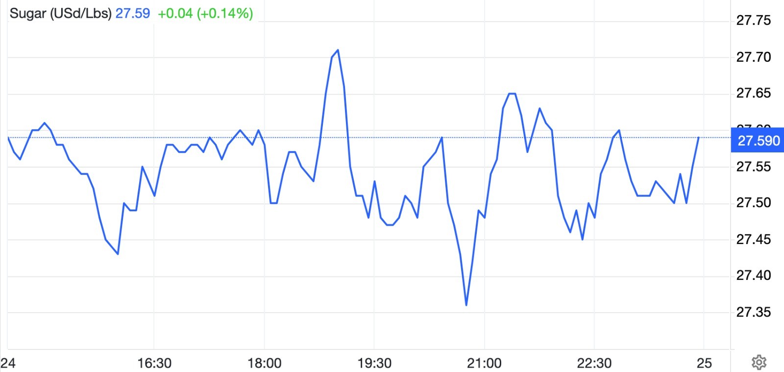 IDXChannel - Harga gula mentah berjangka di AS naik di atas 27,53 sen per pon (USd/Lbs) per 24 Oktober 2023. Harga komoditas tersebut mencapai yang tertinggi dalam 12 tahun di tengah meningkatnya ancaman rendahnya pasokan global.