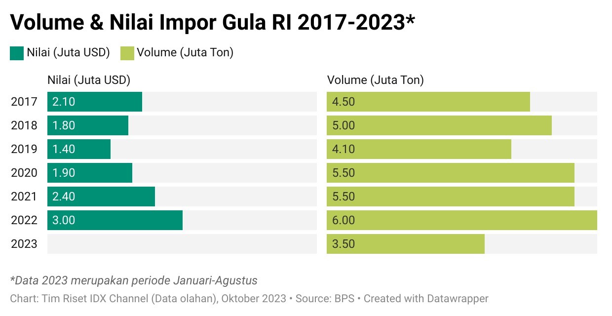 Sepanjang 2022, BPS juga mencatat impor gula RI mencapai 6 juta ton dengan nilai mencapai USD3 juta. (Lihat grafik di bawah ini.)