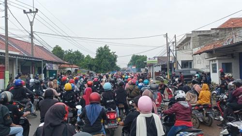 "(Kemacetan ) mungkin ada sekitar 1 kilometer Kang. Ada 20 ribuan yang turun," kata salah satu buruh, Dede di sela-sela mengatur lalu lintas.