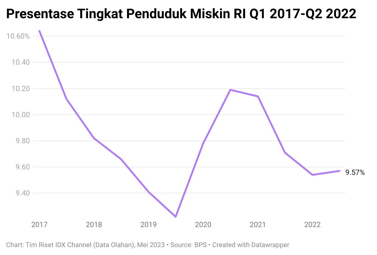 Kemiskinan di Indonesia terpantau terus melandai dalam lima tahun terakhir. Hal ini diungkapkan data BPS di mana hingga kuartal 2 tahun lalu, tingkat kemiskinan di Indonesia berada di level 9,57%. (Lihat grafik di bawah ini.)