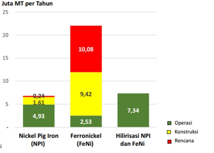 Data ESDM mencatat, produksi NPI sepanjang 2022 telah mencapai 4,93 juta MT per tahun dan 2,53 juta MT untuk produksi FeNi. Adapun untuk hilirisasi NPI dan FeNi mencapai 7,34 juta MT. (Lihat grafik di bawah ini.)