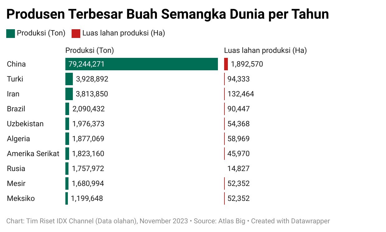 Mengutip data Atlas Big, China adalah negara produsen terbesar buah berbiji hitam dan berwarna merah ini yang mencapai 79 juta ton per tahunnya. China juga memiliki lahan tanam semangka terluas mencapai 1,89 juta hektare (Ha). (Lihat grafik di bawah ini.)