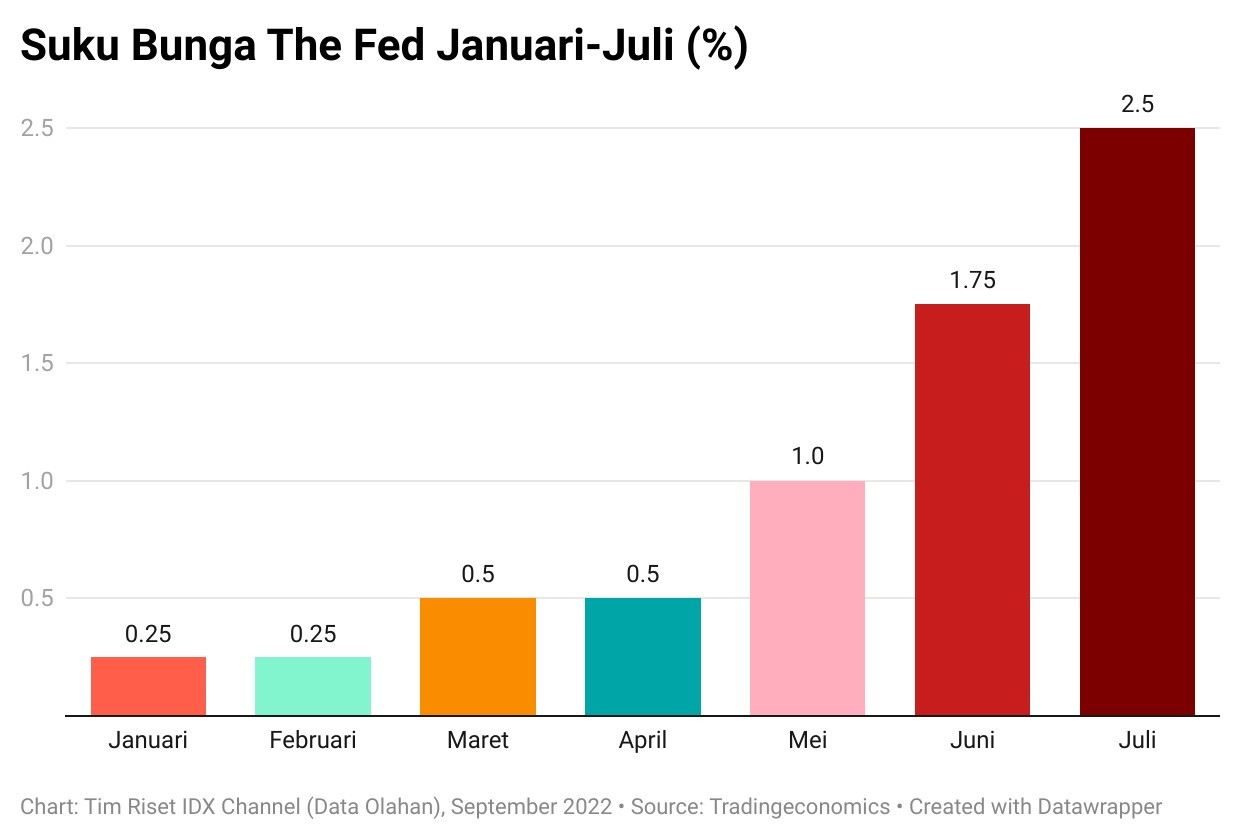 Tercatat kenaikan suku bunga The Fed sudah terjadi empat kali sepanjang tahun 2022 ini. Bank Sentral ini telah menaikkan suku bunga acuannya sebesar 150 basis poin (bps) sepanjang semester pertama 2022.