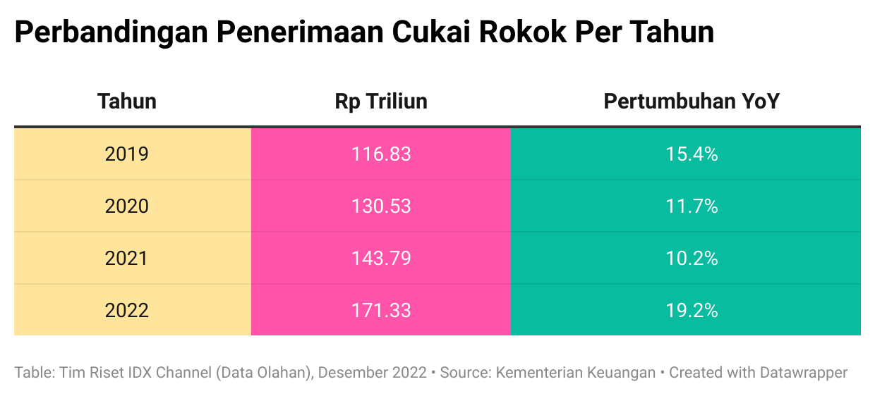 Adapun realisasi penerimaan CHT periode Januari-Oktober 2022 sebesar Rp171,33 triliun atau tumbuh 19,15% secara tahunan (yoy). Pada periode yang sama tahun sebelumnya yang tumbuh 10,16%.