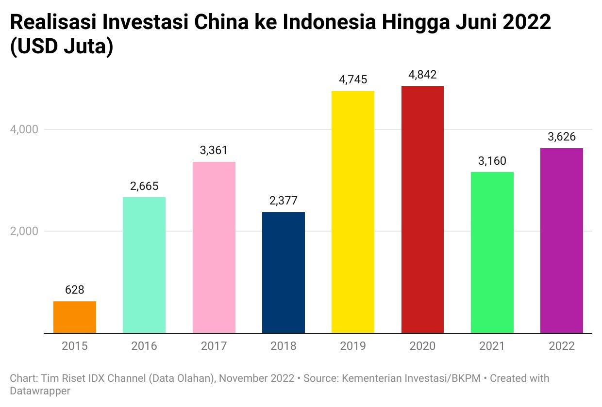 Data juga menunjukkan bahwa China telah menggandakan investasi di Indonesia pada paruh pertama 2022 menjadi USD3,6 miliar dari tahun sebelumnya yang berjumlah USD3,1 miliar.