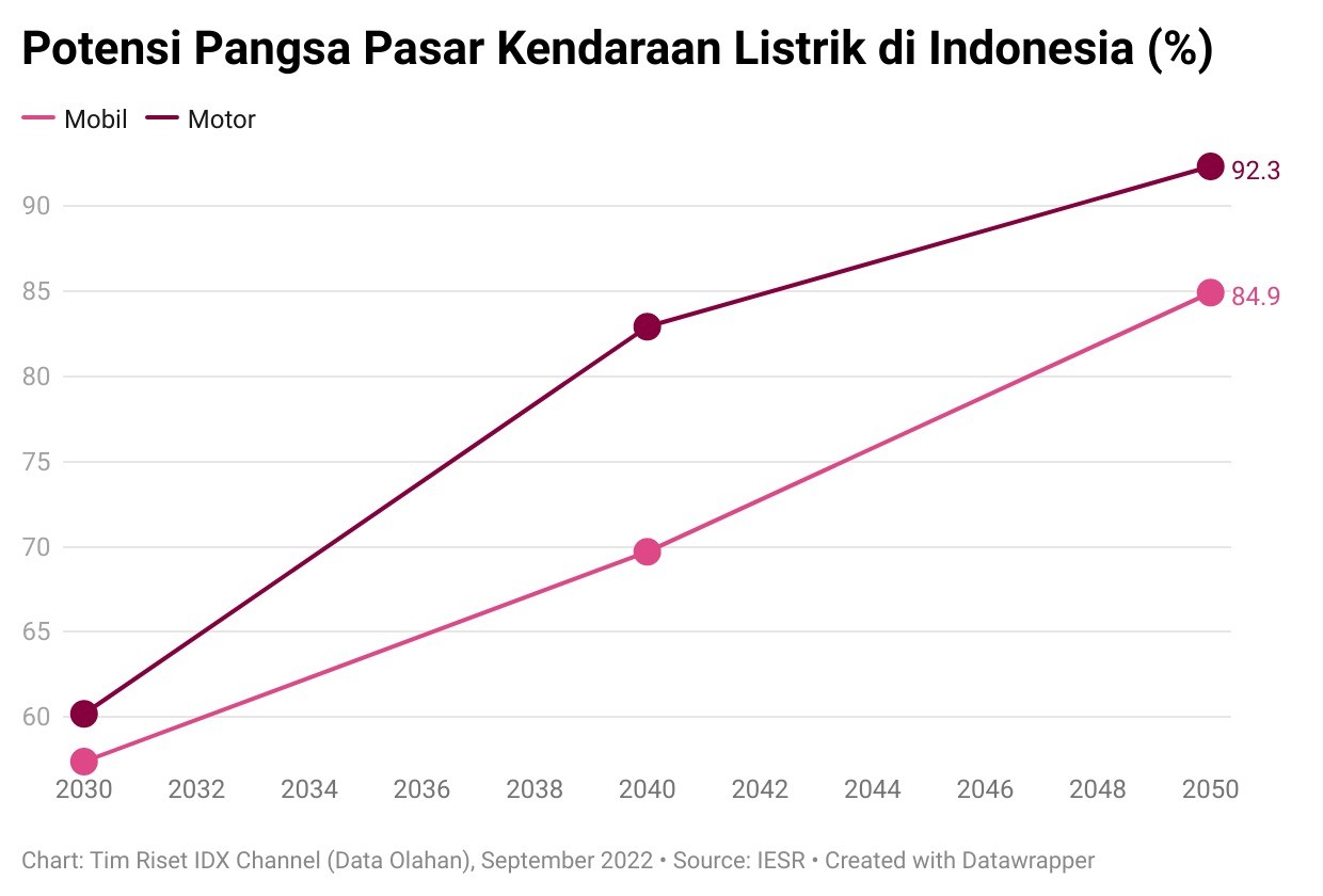 Berdasarkan keterangan Kementerian ESDM, Indonesia memiliki target produksi kendaraan listrik yang cukup ambisius. Pemerintah Indonesia menargetkan 2 juta unit mobil listrik dan 3 juta unit motor listrik pada 2030.