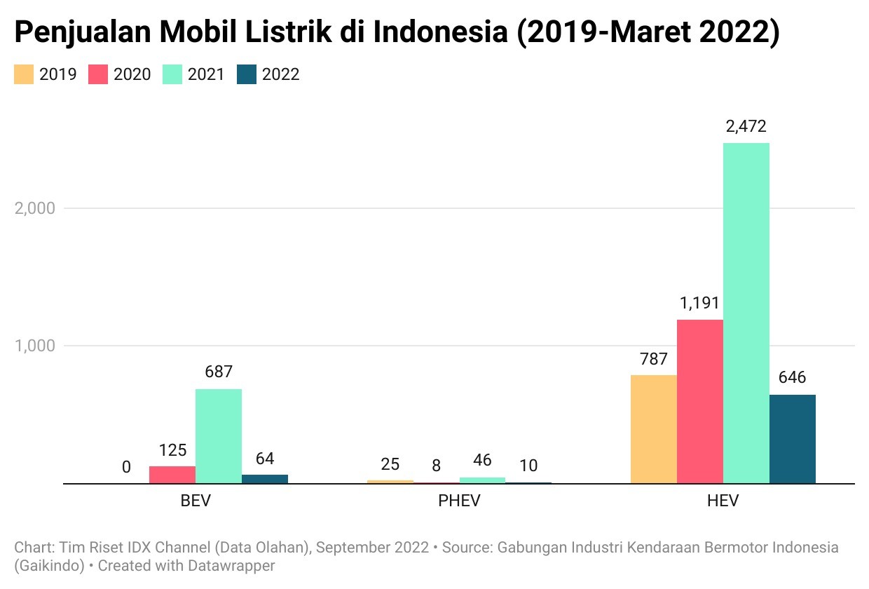 Hingga Maret 2022, penjualan mobil jenis HEV tercatat yang tertinggi yakni mencapai 646 unit. Di tahun sebelumnya, penjualan HEV tercatat paling tinggi sejak 2019 mencapai 2.472 unit. (Lihat tabel di bawah ini.)