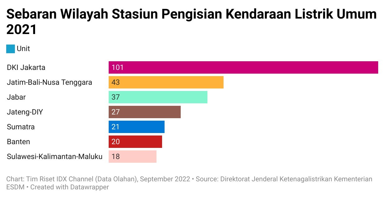 Direktorat Jenderal Ketenagalistrikan Kementerian ESDM mencatat ada 267 unit Stasiun Pengisian Kendaraan Listrik Umum (SPKLU) dan Charging Station hingga akhir 2021. Jika dilihat dari wilayahnya, mayoritas atau 101 unit berada di DKI Jakarta.