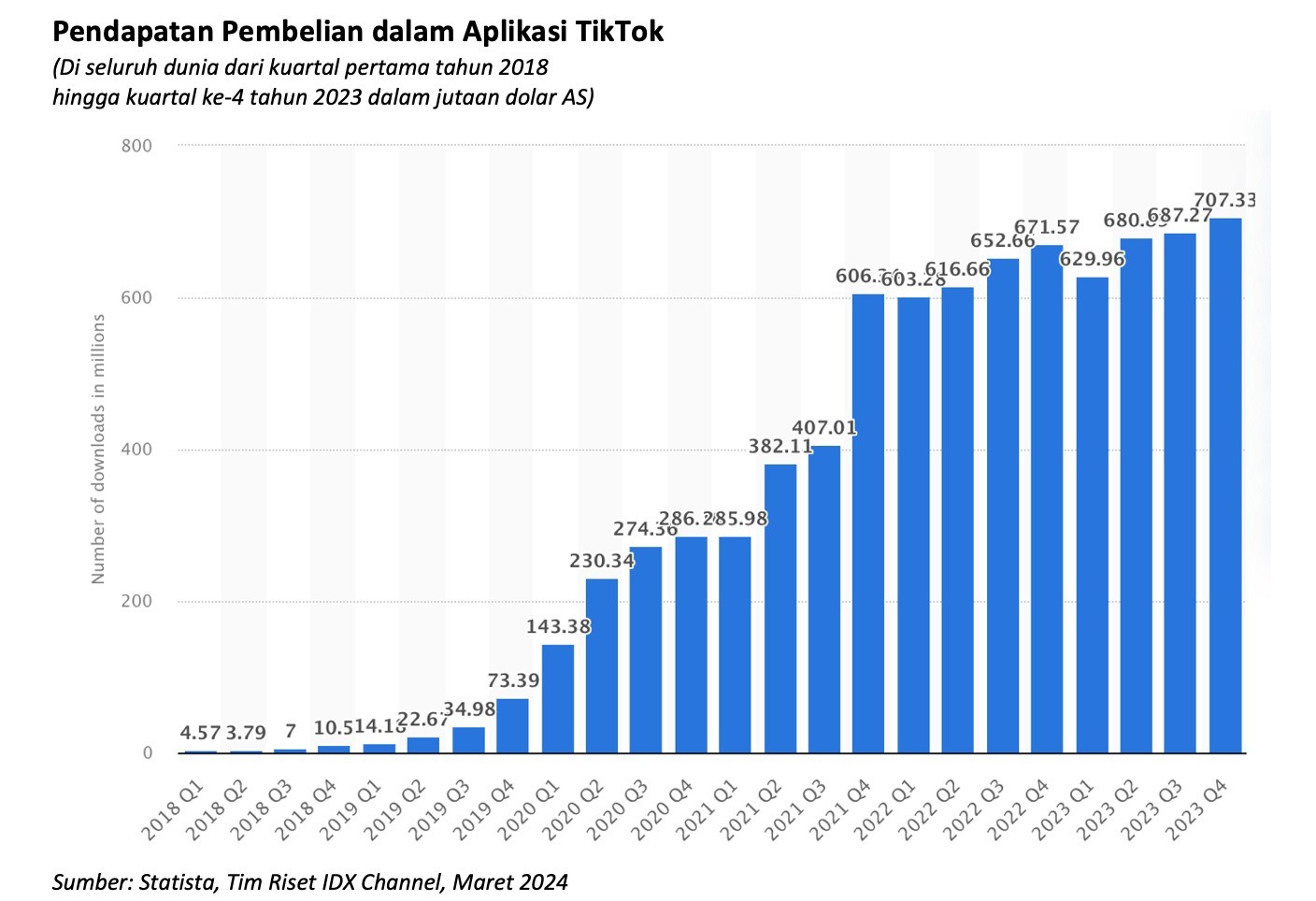Meski banyak dilarang, hal ini tak menyurutkan popularitas TikTok di jagat maya. Melansir Statista, pada kuartal keempat tahun 2023, TikTok menghasilkan pendapatan sekitar USD707 juta dolar AS dari pengguna di seluruh dunia. (Lihat grafik di bawah ini.)