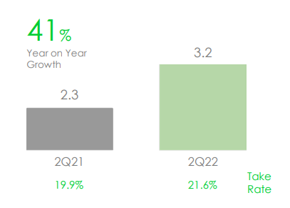 Menurut penjelasan perusahaan, pertumbuhan terhadap pendapatan bruto melampaui pertumbuhan GTV, yang disebabkan oleh take rate yang lebih tinggi, yaitu 173 basis poin lebih tinggi tinimbang dengan kuartal yang sama pada tahun sebelumnya.