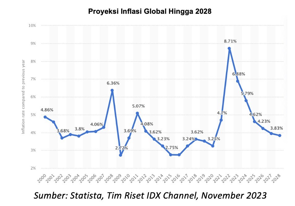 Mengutip Statista, jika tak terjadi guncangan berarti, inflasi global diperkirakan akan moderat pada tahun 2023-2024. Tingkat inflasi global diperkirakan akan turun menjadi 4,4 persen pada 2024.