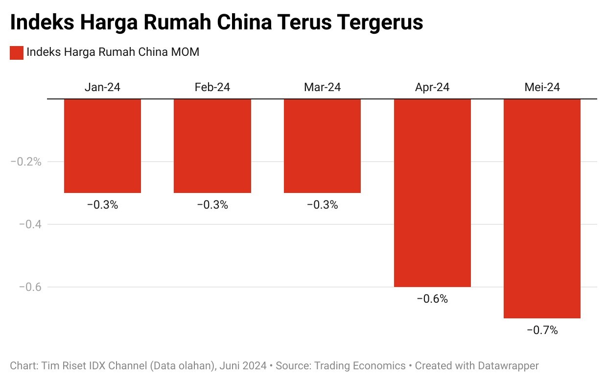 Data terbaru menunjukkan Indeks harga rumah di China turun 0,7 persen secara bulanan (month-to-month/MOM) di Mei 2024, menyusul penurunan 0,6 persen di bulan sebelumnya. (Lihat grafik di bawah ini.)