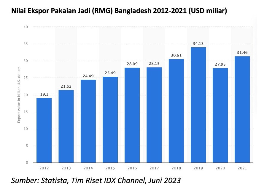 Kesuksesan ekonomi Bangladesh selama ini ditopang oleh RMG dan menghasilkan lebih dari 10% produk domestik bruto (PDB) dan mempekerjakan sekitar 4,4 juta pekerja. Pada 2021, nilai ekspor RMG Bangladesh bahkan mencapai USD31,46 miliar. (Lihat grafik di bawah ini.)