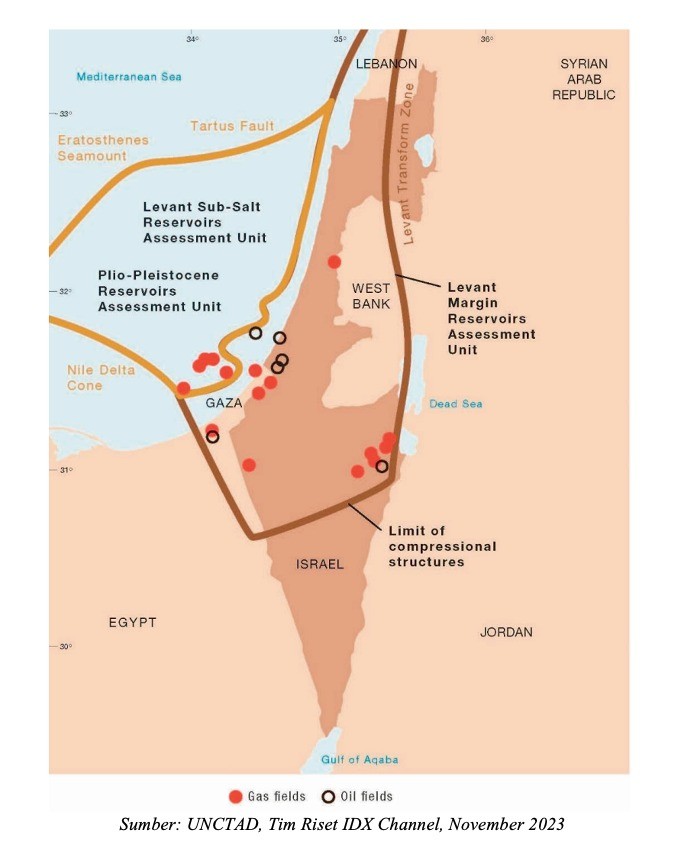 Sebuah studi yang dilakukan oleh United Nations Conference on Trade and Development (UNCTAD) pada 2019 menemukan cadangan gas alam di Cekungan Levant berada pada kisaran 122 triliun kaki kubik (TCF) dan cadangan minyak yang diperkirakan mencapai 1,7 miliar barel (BOE). Cadangan ini memiliki potensi ekonomi senilai USD524 miliar. (Lihat gambar di bawah ini.)
