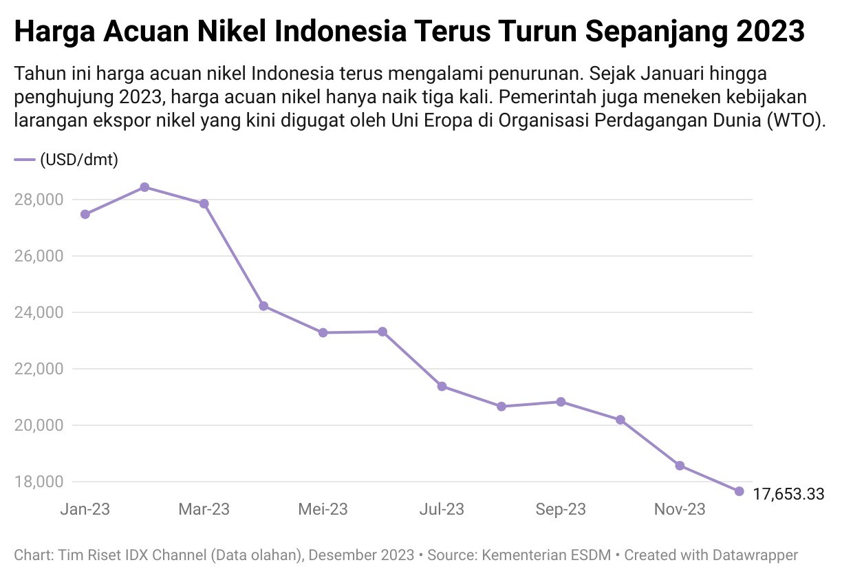 Sejak Januari 2023, harga acuan nikel cukup kesulitan untuk naik. Tercatat, harga acuan nikel dalam negeri hanya naik tiga kali hingga penghujung tahun ini. Di antaranya per Februari 2023 yang ditetapkan USD28.444 per dmt, Juni 2023 yang diketok USD23.317 per dmt, dan September sebesar USD20.827 per dmt.