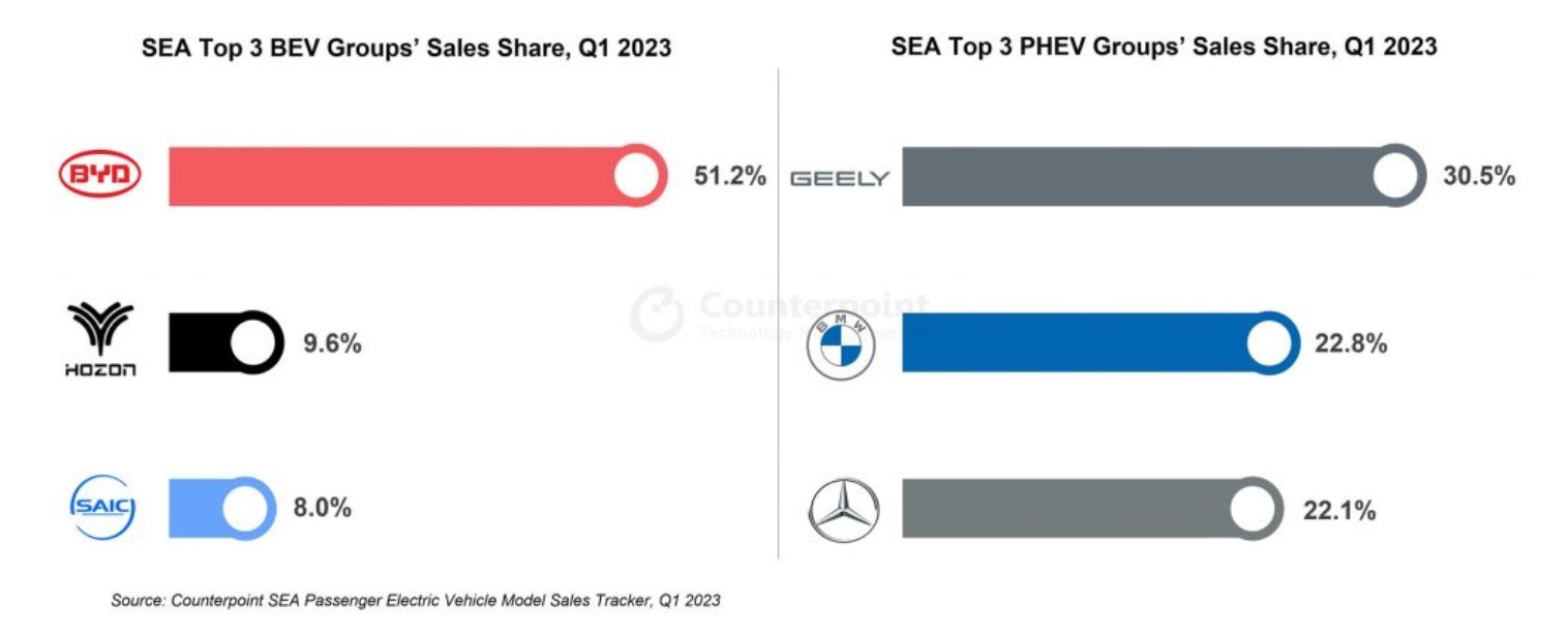 Pada Q1 2023, BYD Group memimpin penjualan kendaraan listrik jenis BEV (Battery Electric Vehicle) di kawasan Asia Tenggara. Tiga grup teratas, yakni BYD, Hozon New Energy dan SAIC Group secara kolektif menyumbang lebih dari 68 persen pasar BEV.