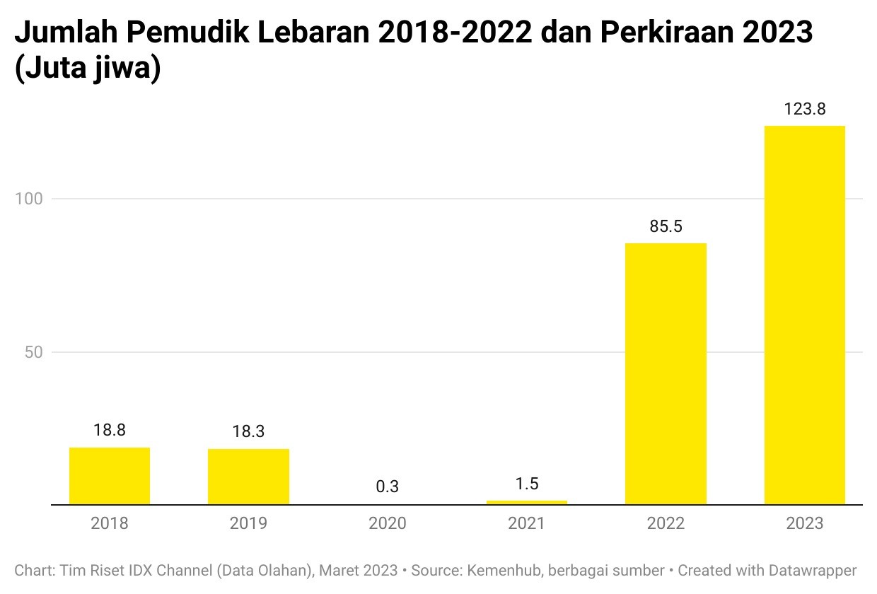 Sebagai ilustrasi kasar, tahun ini, Kementerian Perhubungan memperkirakan jumlah pemudik akan mencapai lebih dari 123 juta jiwa. Angka ini meningkat drastis, mengingat masyarakat Indonesia telah menahan mudik pada 2020 hingga 2021 akibat adanya gelombang pandemi Covid-19. (Lihat grafik di bawah ini.)