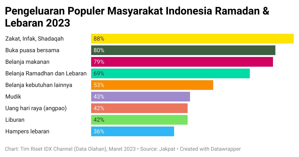 Optimisme geliat konsumsi ini semakin menambah semarak Ramadan dan Idul Fitri 2023. Menurut survei Jakpat membuat yang bertajuk Welcoming 2023 Ramadan & Eid yang dirilis pada Rabu (15/3) lalu, potensi pengeluaran utama masyarakat muslim Indonesia pada bulan Ramadan dan menjelang Idul Fitri.