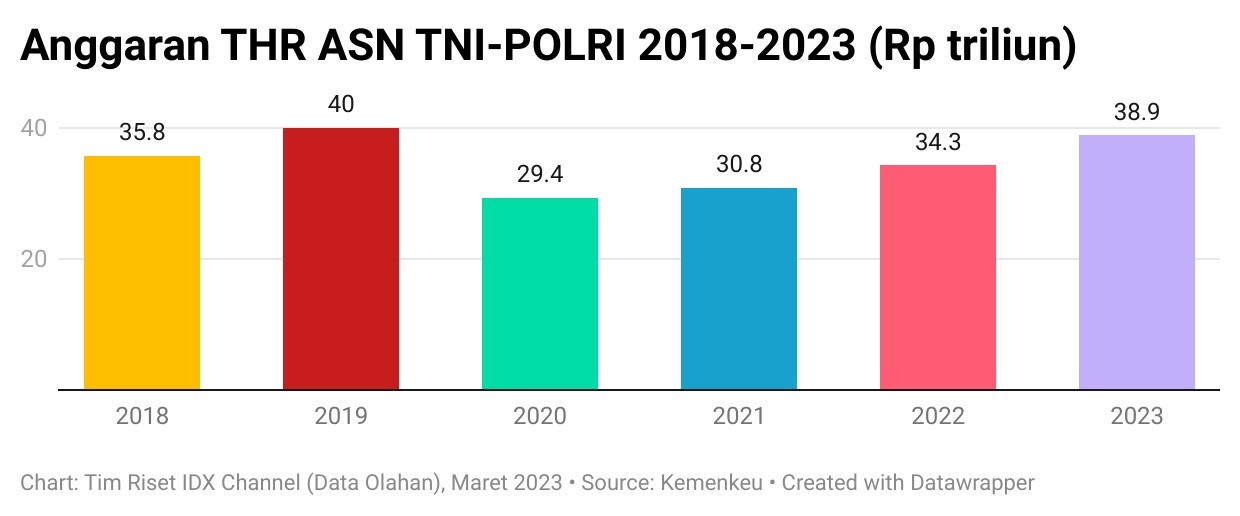 Pemerintah telah menganggarkan THR untuk ASN, TNI-Polri lebih besar dibanding tahun kemarin. Total anggaran THR pada 2022 yang disiapkan sebesar Rp 34,3 triliun. Tahun ini, pemerintah menganggarkan Rp 38,9 triliun untuk membayar THR 2023. Angka ini meningkat Rp4,6 triliun dibanding tahun lalu.