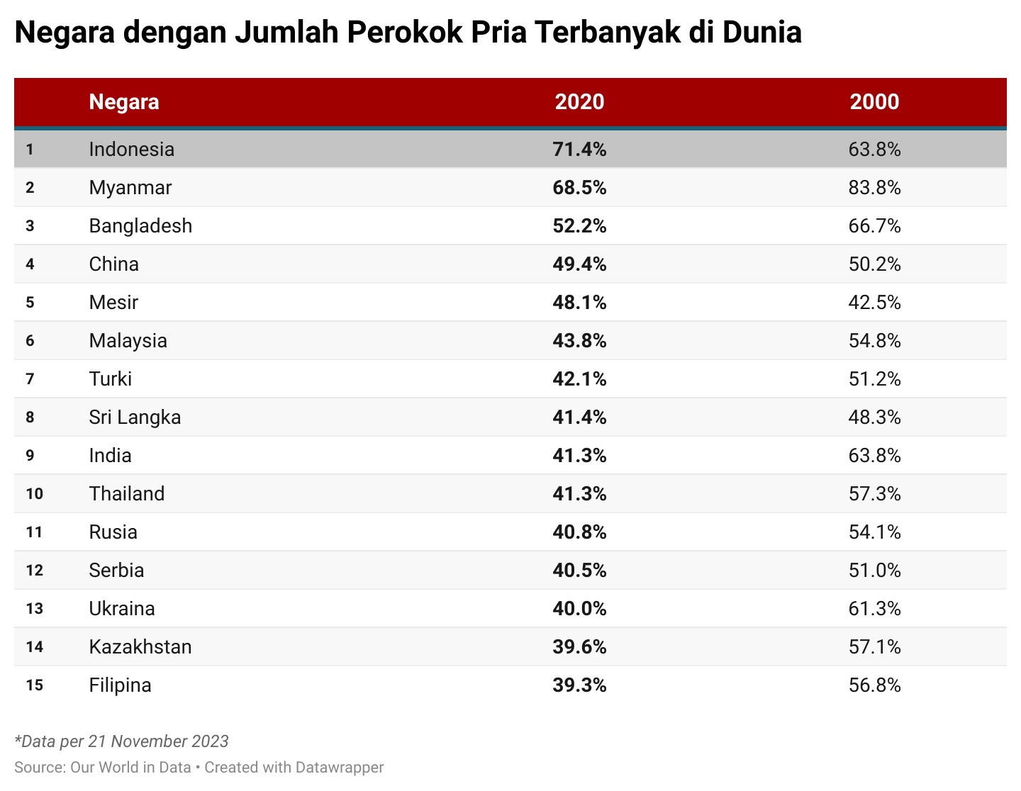 Melansir laporan resmi Our World in Data, Selasa (21/11/2023), Indonesia menjadi nomor satu dengan Myanmar dan Bangladesh berada di peringkat selanjutnya. data tersebut diolah berdasarkan persentase pria berusia 15 tahun ke atas yang merokok dalam bentuk apa pun, termasuk rokok, cerutu/sigar, pipa atau produk tembakau lainnya.