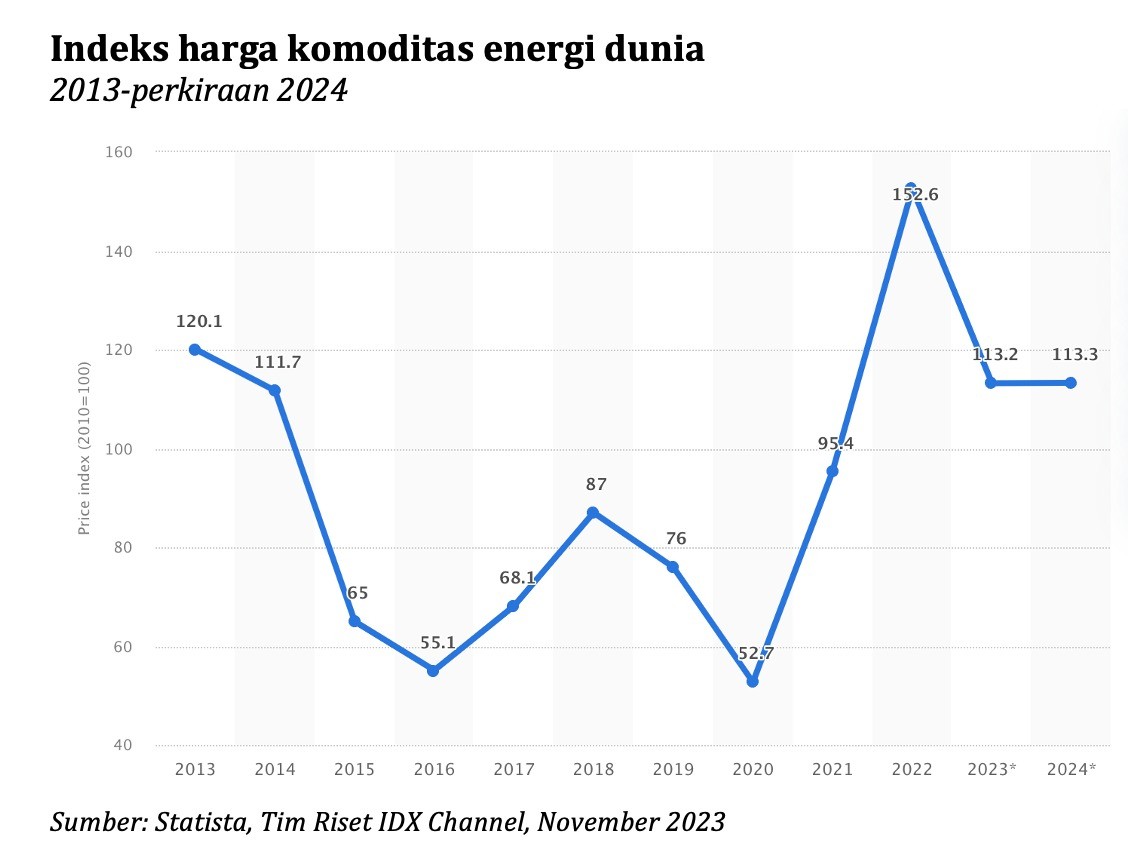 Jika merujuk data Statista, indeks harga energi global berada pada kisaran 152,6 pada 2022. Angka ini meningkat dibandingkan tahun sebelumnya dan merupakan dampak dari meningkatnya permintaan bahan bakar dan listrik seiring dengan pulihnya perekonomian dari pandemi virus corona. Untuk 2023, perkiraan menunjukkan indeks harga akan turun menjadi 113. (Lihat grafik di bawah ini.)