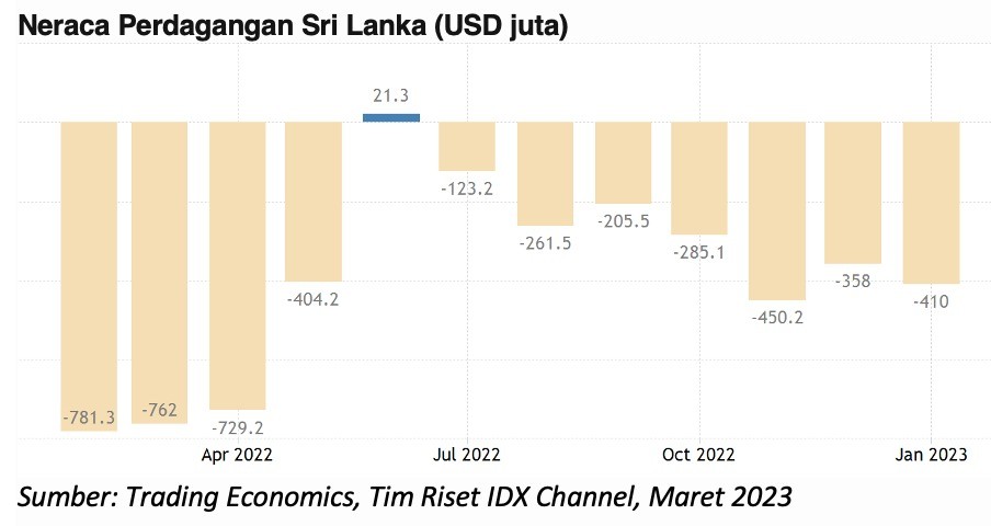 Sri Lanka juga terus mengalami defisit perdagangan sepanjang 2022 dengan nilai defisit terparah di awal tahun lalu mencapai minus USD858,5 juta. Defisit perdagangan ini menurun menjadi USD 410 juta pada Januari 2023. (Lihat grafik di bawah ini.)
