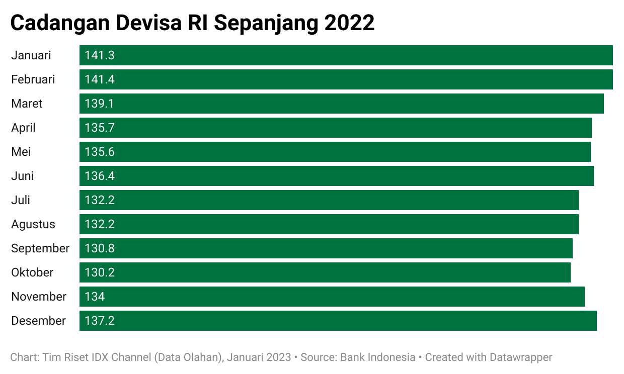 Adapun pada November 2022 cadev RI sebesar USD134,0 miliar. Nilai itu meningkat dibandingkan dengan posisi pada akhir Oktober 2022 sebesar USD130,2 miliar.